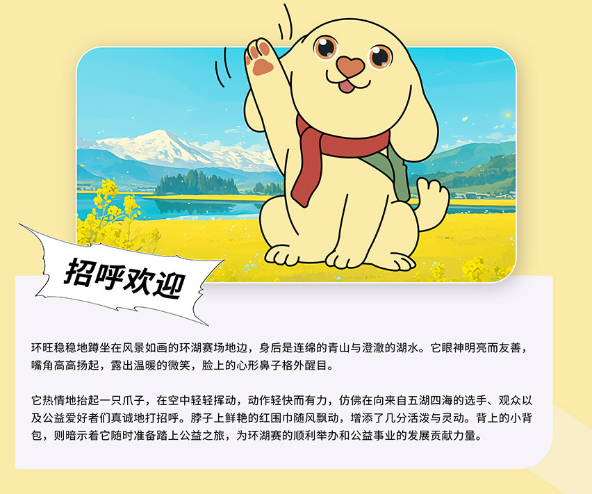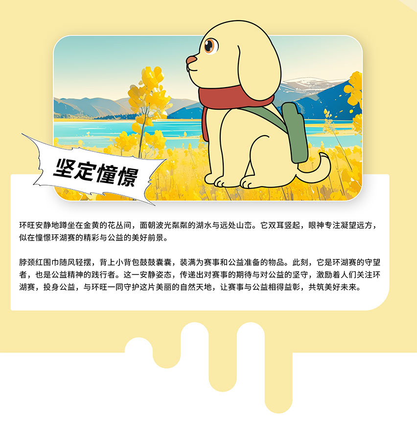 The enthusiastic Golden Retriever Huanwang, Wagging its tail, Carrying a small backpack and using warmth to closely connect everyone together. The five of us carry the responsibility of the Tour of Qinghai Lake, Altruism, Honor, Freedom, We invite you to join us in cheering for the event and public welfare!
